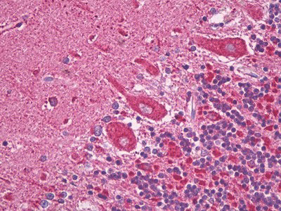 Anti-SOGA1 antibody IHC of human brain, cerebellum, Purkinje. |