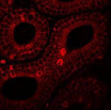 Immunofluorescence of SPINK2 in mouse testis tissue with SPINK2 antibody at 20 g/mL. |