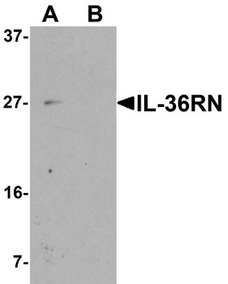 Western blot analysis of IL-36RN in 3T3 cell lysate with IL-36RN antibody at 1 ug/ml in (A) the... |