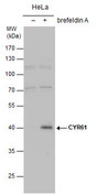 Un-treated (-) and treated (+, 1x Brefeldin A treatment for 24 hrs) HeLa whole cell extracts (30... |