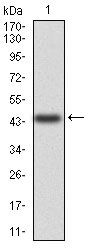 Figure 2: Western blot analysis using ANXA5 mAb against human ANXA5 (AA: 160-320) recombinant protein. (Expected MW is 44.1 kDa)