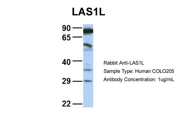 LAS1L Antibody - middle region (APR00576G) in Human COLO205 cells using Western BlotHost: Rabbit Target Name: LAS1L Sample Tissue: COLO205 Antibody Dilution: 1.0μg/mlLAS1L is supported by BioGPS gene expression data to be expressed in COLO205