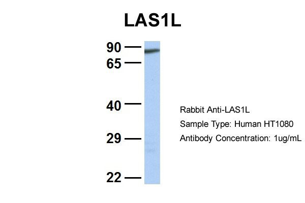 LAS1L Antibody - middle region (APR00576G) in Human HT1080 cells using Western BlotHost: Rabbit Target Name: LAS1L Sample Tissue: HT1080 Antibody Dilution: 1.0μg/mlLAS1L is supported by BioGPS gene expression data to be expressed in HT1080 |