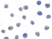 Immunocytochemistry of IKK alpha in Jurkat cells with IKK alpha antibody at 1 μg/mL.