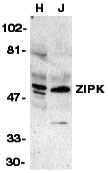 Western blot analysis of ZIP kinase in HeLa (H) and Jurkat (J) whole cell lysates with ZIP kinase antibody at 1 μg/mL.