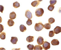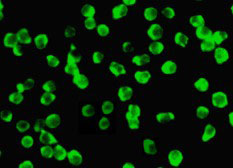 Immunocytochemistry of ZIP kinase in Jurkat cells with ZIP kinase antibody at 10 μg/mL.