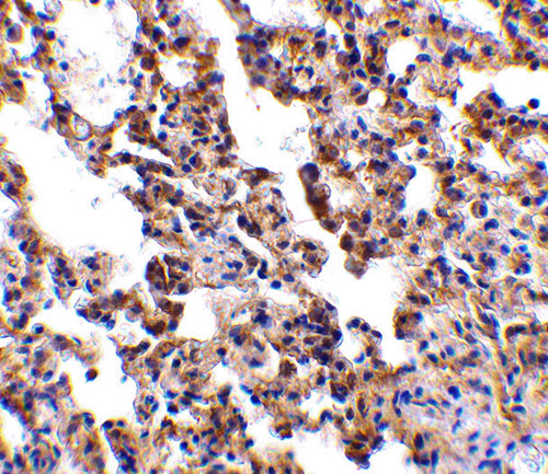 Immunofluorescence of IL-21 Receptor in Rat Lung cells with IL-21 Receptor antibody at 20 μg/mL. |