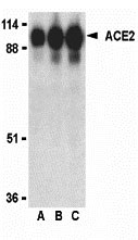 ACE2 Antibody: Angiotensin-converting enzyme 2 (ACE2) plays a central role in vascular, renal, and myocardial physiology. In contrast to its homolog ACE, ACE2 expression is restricted to heart, kidney, and testis. Recently. ACE2 has also been shown to be a functional receptor of the SARS coronavirus. The normal function of ACE2 is to convert the inactive vasoconstrictor angiotensin I (AngI) to Ang1-9 and the active form AngII to Ang1-7, unlike ACE, which converts AngI to AngII. While the role of these vasoactive peptides is not well understood, lack of ACE2 expression in ace2-/ace2- mice leads to severely reduced cardiac contractility, indicating its importance in regulating heart function.