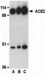 ACE2 Antibody: Angiotensin-converting enzyme 2 (ACE2) plays a central role in vascular, renal, and myocardial physiology. In contrast to its homolog ACE, ACE2 expression is restricted to heart, kidney, and testis. Recently. ACE2 has also been shown to be a functional receptor of the SARS coronavirus. The normal function of ACE2 is to convert the inactive vasoconstrictor angiotensin I (AngI) to Ang1-9 and the active form AngII to Ang1-7, unlike ACE, which converts AngI to AngII. While the role of these vasoactive peptides is not well understood, lack of ACE2 expression in ace2-/ace2- mice leads to severely reduced cardiac contractility, indicating its importance in regulating heart function.