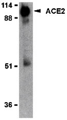ACE2 Antibody: Angiotensin-converting enzyme 2 (ACE2) plays a central role in vascular, renal, and myocardial physiology. In contrast to its homolog ACE, ACE2 expression is restricted to heart, kidney, and testis. Recently. ACE2 has also been shown to be a functional receptor of the SARS coronavirus. The normal function of ACE2 is to convert the inactive vasoconstrictor angiotensin I (AngI) to Ang1-9 and the active form AngII to Ang1-7, unlike ACE, which converts AngI to AngII. While the role of these vasoactive peptides is not well understood, lack of ACE2 expression in ace2-/ace2- mice leads to severely reduced cardiac contractility, indicating its importance in regulating heart function.