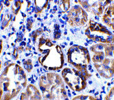 Immunohistochemistry of ACE2 in human kidney tissue with ACE2 antibody at 2 μg/mL.