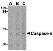 Caspase-5 Antibody: Caspases are a family of cysteine proteases that can be divided into the apoptotic and inflammatory caspase subfamilies. Unlike the apoptotic caspases, members of the inflammatory subfamily are generally not involved in cell death but are associated with the immune response to microbial pathogens. Members of this subfamily include caspase-1, -4, -5, and -12. Activation of these caspases results in the cleavage and activation of proinflammatory cytokines such as IL-1β and IL-18. Caspase-5 can interact with caspase-1; both are constituents of the NALP1 inflammasome, a complex that can trigger the cleavage of pro-IL-1β. Expression of caspase-5 can be regulated by lipopolysaccharide (LPS) and IFN-gamma.