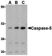 Caspase-5 Antibody: Caspases are a family of cysteine proteases that can be divided into the apoptotic and inflammatory caspase subfamilies. Unlike the apoptotic caspases, members of the inflammatory subfamily are generally not involved in cell death but are associated with the immune response to microbial pathogens. Members of this subfamily include caspase-1, -4, -5, and -12. Activation of these caspases results in the cleavage and activation of proinflammatory cytokines such as IL-1β and IL-18. Caspase-5 can interact with caspase-1; both are constituents of the NALP1 inflammasome, a complex that can trigger the cleavage of pro-IL-1β. Expression of caspase-5 can be regulated by lipopolysaccharide (LPS) and IFN-gamma.