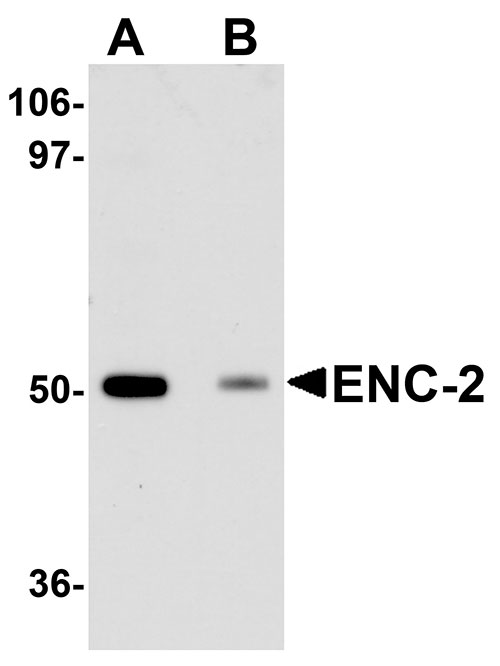 ENC-2 Antibody: The ectoderm-neural cortex-2 (ENC-2) protein a member of the BTB/PDZ Kelch protein family displaying significant homology to ENC-1, an actin-binding protein involved in neural fate specification during embryogenesis and adipocyte maturation. The exact function of ENC-2 has yet to be determined, but it has been suggested to be involved in the differentiation of neuronal precursor cells into neurons and astrocytes.