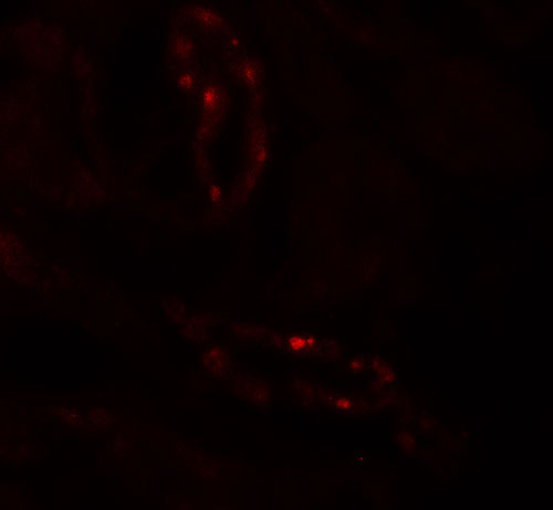 Immunofluorescence of SCUBE3 in human kidney tissue with SCUBE3 antibody at 20 μg/mL. |