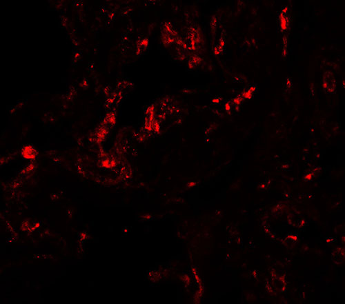 Immunofluorescence of GDF1 in human lung tissue with GDF1 antibody at 20 μg/mL. |