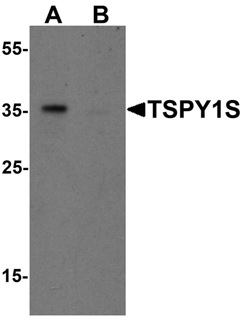 Western blot analysis of TSPY1S in A20 cell lysate with TSPY1S antibody at 1 μg/mL in (A) the absence and (B) the presence of blocking peptide. |