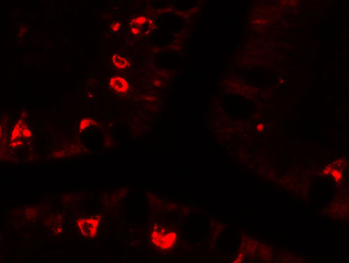 Immunofluorescence of AGR2 in human small intestine tissue with AGR2 antibody at 20 μg/ml. |