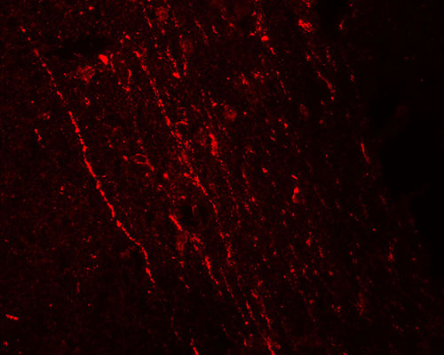 Immunofluorescence of FGFR3 in rat brain tissue with FGFR3 antibody at 20 μg/mL. |