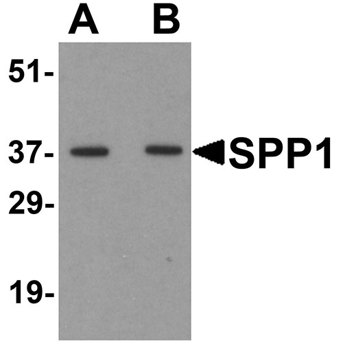 SPP1 Antibody: The secreted protein 1 (SPP1), also known as osteopontin, is a major noncollagenous protein of bone, but is also found in the extracellular matrix of other mineralized tissues and in bodily fluids. In bone, SPP1 is produced by osteoblasts, osteocytes, macrophages, and osteoclasts (1,2). SPP1 binds to cells through integrin and non-integrin receptors, as well as the adhesion receptor CD44 in an RGD-independent manner, enabling SPP1 to induce a number of functional effects including macrophage chemotaxis, cytoprotection, and regulation of T helper type 1 cells (2). SPP1 can regulate biomineralization by inhibiting the formation of hydroxyapatite (3) and the growth of calcium oxalate crystals (4).