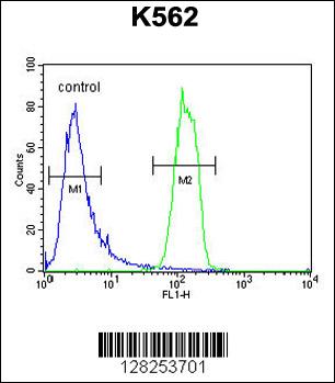 OR2M3 Antibody (C-term) (Cat. APR14173G) flow cytometric analysis of K562 cells (right histogram) compared to a negative control cell (left histogram).FITC-conjugated goat-anti-rabbit secondary antibodies were used for the analysis. |