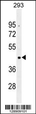 OR10G2 Antibody (N-term) (Cat. APR14151G) western blot analysis in 293 cell line lysates (35ug/lane).This demonstrates the OR10G2 antibody detected the OR10G2 protein (arrow). |