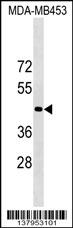 OR1N2 Antibody (N-term) (Cat. APR14159G) western blot analysis in MDA-MB453 cell line lysates (35ug/lane).This demonstrates the OR1N2 antibody detected the OR1N2 protein (arrow). |