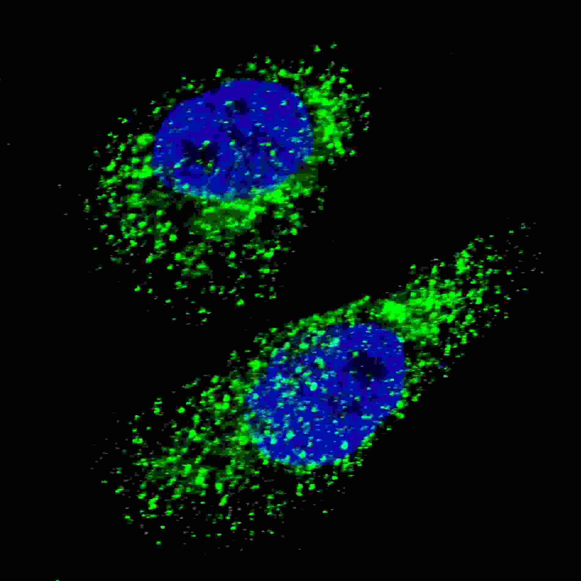 Fluorescent image of U251 cells stained with LC3 (APG8A) (D106) antibody. U251 cells were treated with Chloroquine (50 μM,16h), then fixed with 4% PFA (20 min), permeabilized with Triton X-100 (0.2%, 30 min). Cells were then incubated with APR08156G LC3 (APG8A) (D106) primary antibody (1:100, 2 h at room temperature). For secondary antibody, Alexa Fluor? 488 conjugated donkey anti-rabbit antibody (green) was used (1:1000, 1h). Nuclei were counterstained with Hoechst 33342 (blue) (10 μg/ml, 5 min). LC3 immunoreactivity is localized to autophagic vacuoles in the cytoplasm of U251 cells.
