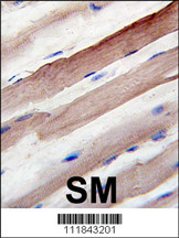 Formalin-fixed and paraffin-embedded human skeletal muscle reacted with Autophagy APG4B Antibody (E273)(Cat. APR10858G), which was peroxidase-conjugated to the secondary antibody, followed by DAB staining. This data demonstrates the use of this antibody for immunohistochemistry; clinical relevance has not been evaluated. |
