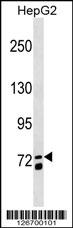 MS4A14 Antibody (C-term) (Cat. AMM08654G) western blot analysis in HepG2 cell line lysates (35ug/lane).This demonstrates the MS4A14 antibody detected the MS4A14 protein (arrow). |