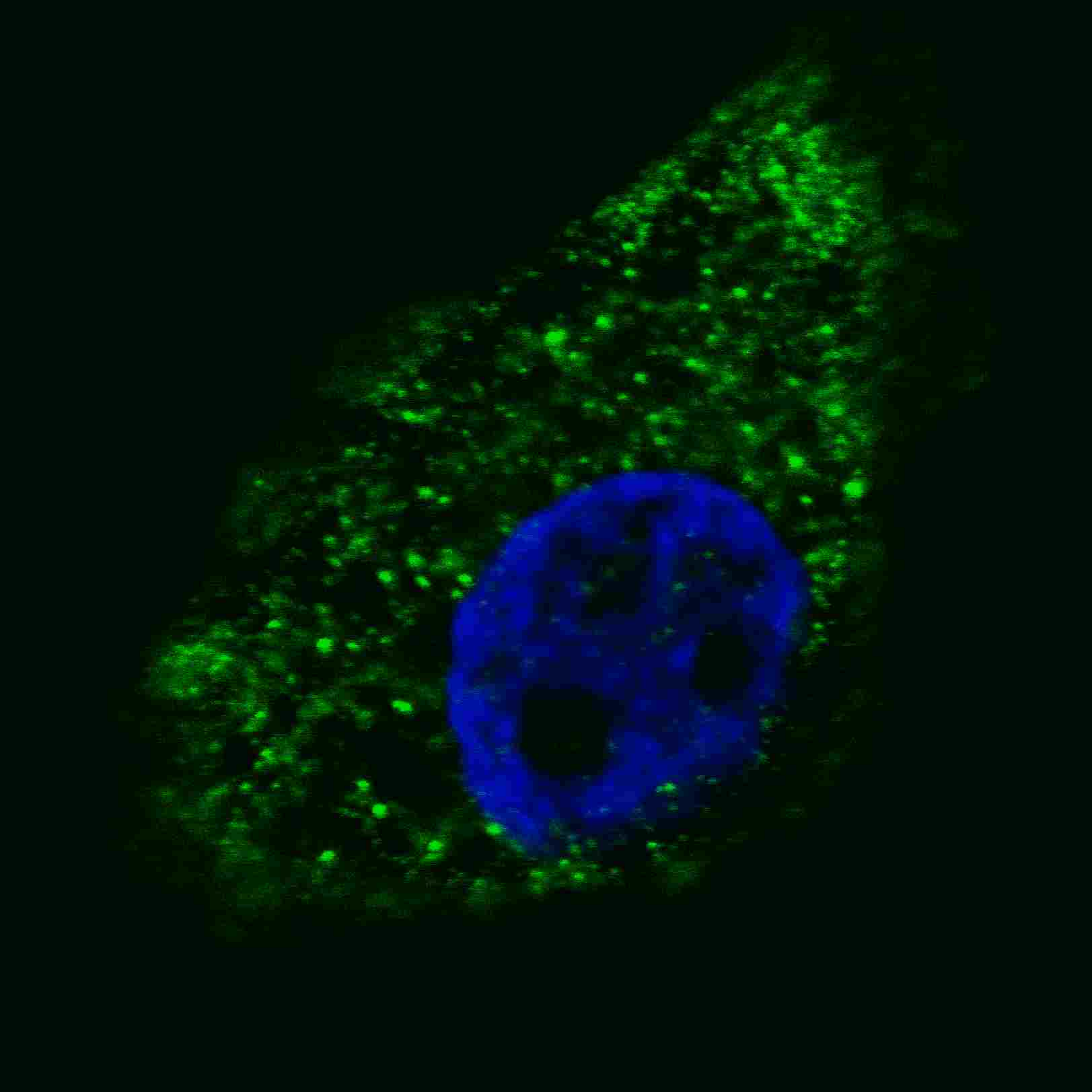 Fluorescent image of U251 cells stained with ATG16L (N-term) antibody. U251 cells were treated with Chloroquine (50 μM,16h), then fixed with 4% PFA (20 min), permeabilized with Triton X-100 (0.2%, 30 min). Cells were then incubated with APG02027G ATG16L (N-term) primary antibody (1:100, 2 h at room temperature). For secondary antibody, Alexa Fluor? 488 conjugated donkey anti-rabbit antibody (green) was used (1:1000, 1h). Nuclei were counterstained with Hoechst 33342 (blue) (10 μg/ml, 5 min). ATG16L immunoreactivity is localized to autophagic vacuoles in the cytoplasm of U251 cells, supported by Human Protein Atlas Data (http://www.proteinatlas.org/ENSG00000085978).