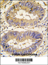 Formalin-fixed and paraffin-embedded human colon carcinoma tissue reacted with Autophagy APG16L antibody (N-term), which was peroxidase-conjugated to the secondary antibody, followed by DAB staining. This data demonstrates the use of this antibody for immunohistochemistry; clinical relevance has not been evaluated. |