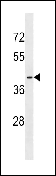 OR56B1 Antibody (N-term) (Cat. APR14214G) western blot analysis in MCF-7 cell line lysates (35ug/lane).This demonstrates the OR56B1 Antibody detected the OR56B1 protein (arrow). |