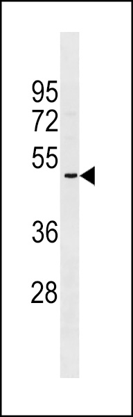 OR2A5 Antibody (C-term) (Cat. APR14164G) western blot analysis in NCI-H460 cell line lysates (35ug/lane).This demonstrates the OR2A5 antibody detected the OR2A5 protein (arrow). |