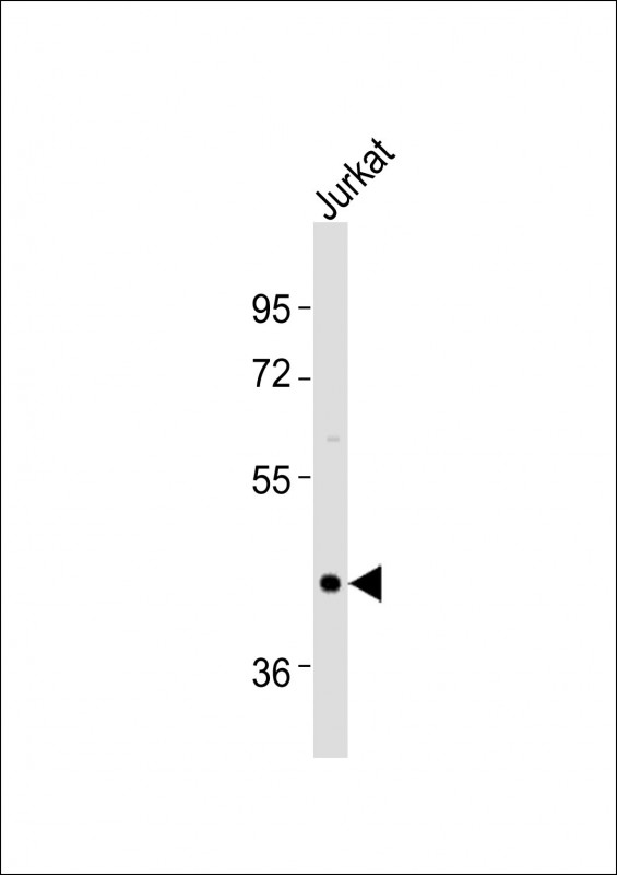 Anti-OXTR Antibody (C-term)at 1:1000 dilution + Jurkat whole cell lysates Lysates/proteins at 20 μg per lane. Secondary Goat Anti-Rabbit IgG, (H+L), Peroxidase conjugated at 1/10000 dilution Predicted band size : 43 kDa Blocking/Dilution buffer: 5% NFDM/TBST. |