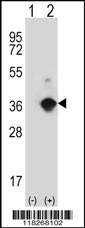 Western blot analysis of ANGPTL7 (arrow) using rabbit polyclonal ANGPTL7 Antibody (N-term) (Cat. APR14088G). 293 cell lysates (2 ug/lane) either nontransfected (Lane 1) or transiently transfected (Lane 2) with the ANGPTL7 gene. |