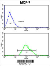 PDK3 Antibody (Cat. APR10843G) FC analysis of MCF-7 cells (bottom histogram) compared to a negative control cell (top histogram). FITC-conjugated goat-anti-rabbit secondary antibodies were used for the analysis. |