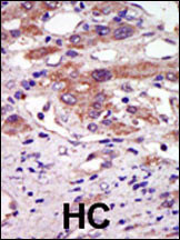 Formalin-fixed and paraffin-embedded human cancer tissue reacted with the primary antibody, which was peroxidase-conjugated to the secondary antibody, followed by AEC staining. This data demonstrates the use of this antibody for immunohistochemistry; clinical relevance has not been evaluated. BC = breast carcinoma; HC = hepatocarcinoma. |