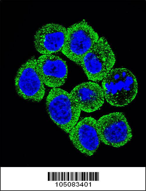 Confocal immunofluorescent analysis of PTEN Antibody (C-term F279)( APR10849G) with Hela cell followed by Alexa Fluor 488-conjugated goat anti-rabbit lgG (green).DAPI was used to stain the cell nuclear (blue).