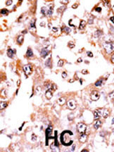 Formalin-fixed and paraffin-embedded human cancer tissue reacted with the primary antibody, which was peroxidase-conjugated to the secondary antibody, followed by AEC staining. This data demonstrates the use of this antibody for immunohistochemistry; clinical relevance has not been evaluated. BC = breast carcinoma; HC = hepatocarcinoma. |