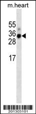 MYOG Antibody (N-term) (Cat. APR17514G) western blot analysis in mouse heart tissue lysates (35μg/lane).This demonstrates the MYOG antibody detected the MYOG protein (arrow). |