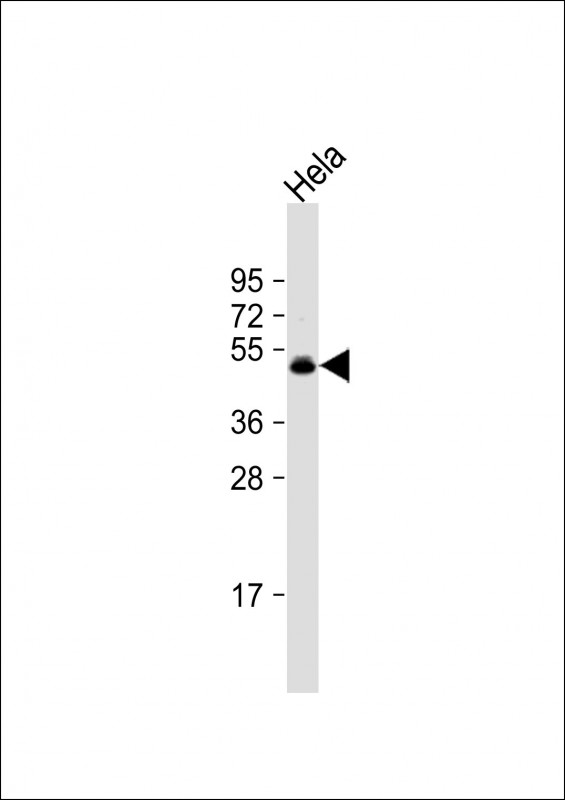 Anti-CEPT1 Antibody (N-term) at 1:1000 dilution + Hela whole cell lysate Lysates/proteins at 20 μg per lane. Secondary Goat Anti-Rabbit IgG, (H+L), Peroxidase conjugated at 1/10000 dilution. Predicted band size : 47 kDa Blocking/Dilution buffer: 5% NFDM/TBST.