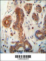 CEPT1 antibody (N-term) (Cat. APG02525G) immunohistochemistry analysis in formalin fixed and paraffin embedded human breast tissue followed by peroxidase conjugation of the secondary antibody and DAB staining. This data demonstrates the use of the CEPT1 antibody (N-term) for immunohistochemistry. Clinical relevance has not been evaluated. |