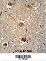 CLU antibody (N-term) (Cat. APG02671G) immunohistochemistry analysis in formalin fixed and paraffin embedded human brain tissue followed by peroxidase conjugation of the secondary antibody and DAB staining. This data demonstrates the use of the CLU antibody (N-term) for immunohistochemistry. Clinical relevance has not been evaluated. |