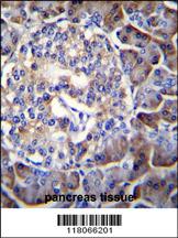 HIP1R Antibody (N-term) (Cat. APR12376G)immunohistochemistry analysis in formalin fixed and paraffin embedded human pancreas tissue followed by peroxidase conjugation of the secondary antibody and DAB staining.This data demonstrates the use of HIP1R Antibody (N-term) for immunohistochemistry. Clinical relevance has not been evaluated.