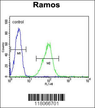 HIP1R Antibody (N-term) (Cat. APR12376G) flow cytometric analysis of Ramos cells (right histogram) compared to a negative control cell (left histogram).FITC-conjugated goat-anti-rabbit secondary antibodies were used for the analysis. |