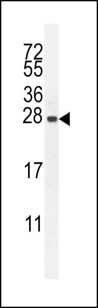 IRGM Antibody (C-term) (Cat. APR08031G) western blot analysis in HepG2 cell line lysates (35ug/lane).This demonstrates the IRGM antibody detected the IRGM protein (arrow).
