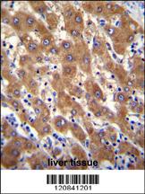 IRGM Antibody (C-term) (Cat. APR08031G)immunohistochemistry analysis in formalin fixed and paraffin embedded human liver tissue followed by peroxidase conjugation of the secondary antibody and DAB staining.This data demonstrates the use of IRGM Antibody (C-term) for immunohistochemistry. Clinical relevance has not been evaluated. |