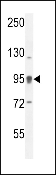 ACAP1 Antibody (N-term) (Cat. APR14781G) western blot analysis in ZR-75-1 cell line lysates (35ug/lane).This demonstrates the ACAP1 antibody detected the ACAP1 protein (arrow).