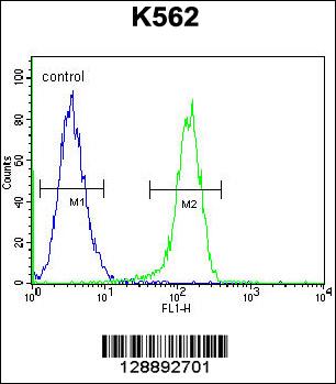 MYO19 Antibody (Center) (Cat. APR17506G) flow cytometric analysis of K562 cells (right histogram) compared to a negative control cell (left histogram).FITC-conjugated goat-anti-rabbit secondary antibodies were used for the analysis. |